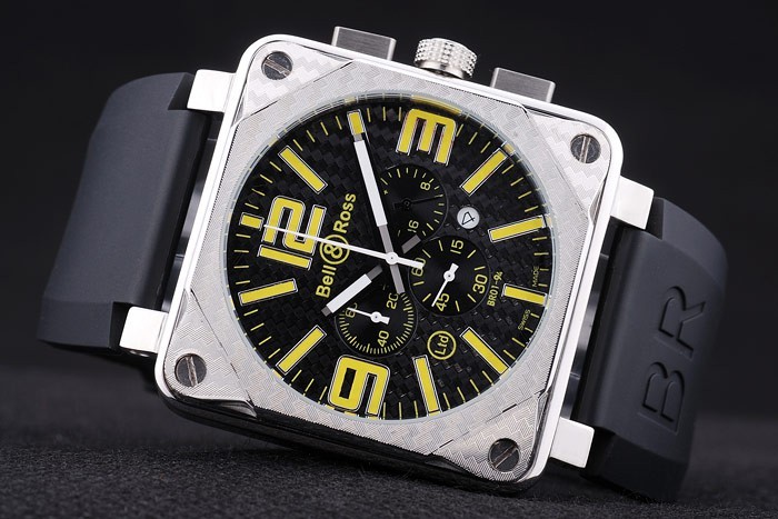 Bracelet: Heat präglade Bell & Ross logotyp och produktkod svart gummiband med BR inskriven borstat rostfritt stål hook-spänne clasp