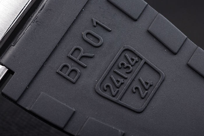 Bracelet: Svart gummiband med värme präglade logo, modellnummer och produktkod och BR graverad borstat rostfritt stål krok-spänne spänne