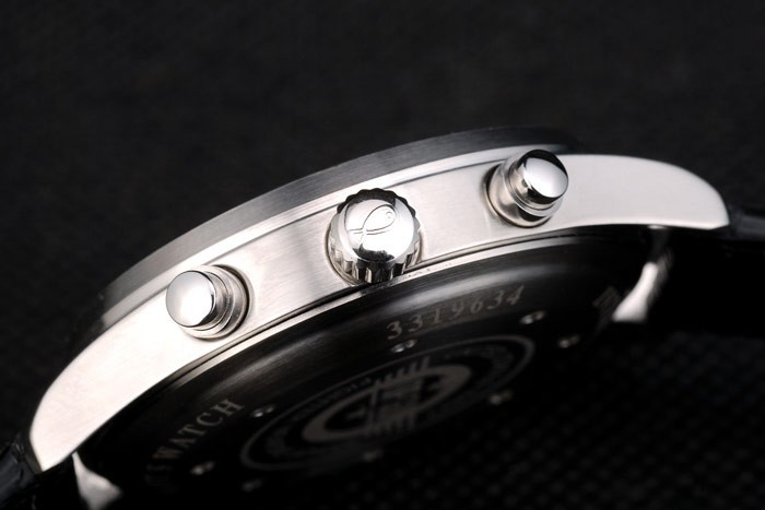 Crown: Polerat cutwork rostfritt stål krona med IWC logo gravyr och två mindre runda tryckknapps kronor på ömse sidor om it