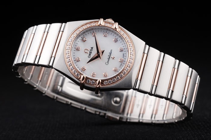 Bracelet: borstat rostfritt stål och rose-guld kedjelänk armband med dold lås och Omega logo på top