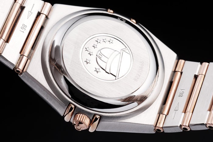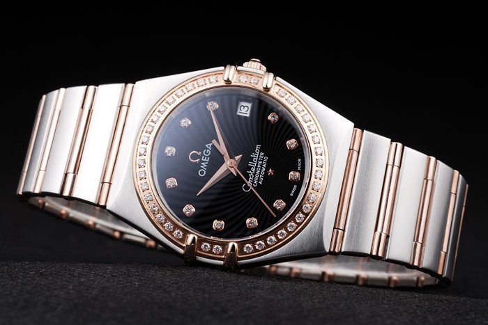 Bracelet: borstat rostfritt stål och rose-guld kedjelänk armband med dold lås och Omega logo på top