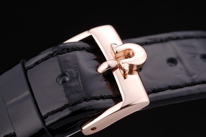 Bracelet: Patent brun orm läderrem med värme präglade Omega stämpel och tätt markerad krok-Omega logo rose-guldspänne clasp