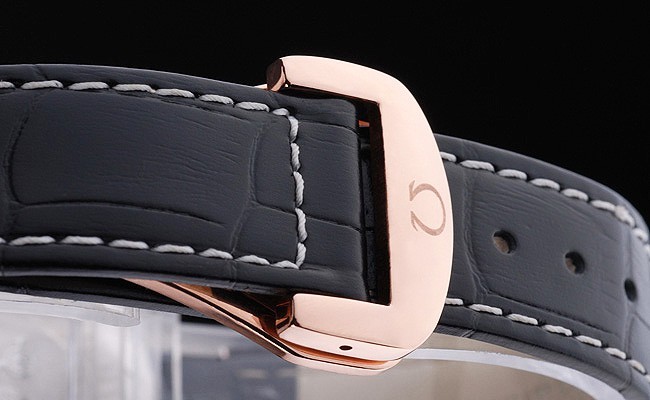 Bracelet: Svart krokodilläderband med vita sömmar och Omega logotyp ingraverad gult guld krok-spänne clasp