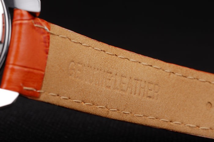 Bracelet: Orange krokodil läderrem med värme präglade Omega stämpel och borstat rostfritt stål krok spänne spänne med Omega logotyp på top