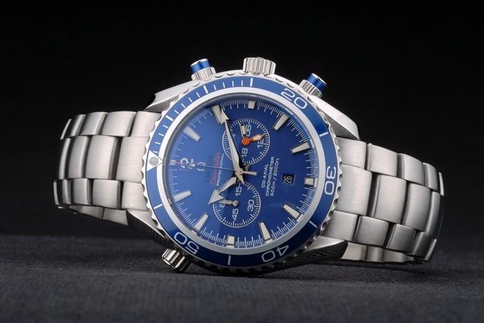 Crown: polerat rostfritt stål cutwork krona med Omega logotyp och en tryckknapp krona på vardera sidan av det plus i cutwork krona på den motsatta sidan