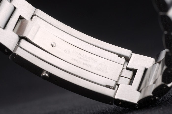 Bezel: Blå emalj polerat rostfritt stål enkelriktad cutwork bezel med index och arabisk siffra sekunder marker