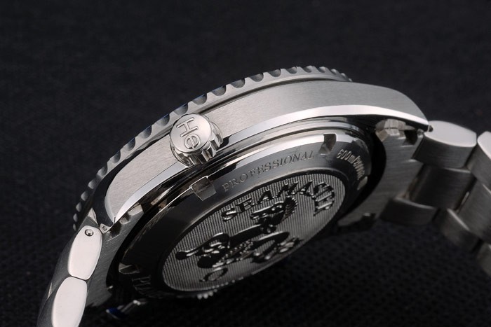 Tillbaka: Polerat rostfritt stål snap-in tillbaka med Omega logotyp och Seamaster Planet Ocean engravings