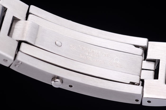 Crown: polerat cutwork rostfritt stål krona med Omega logotyp plus en liknande krona på den motsatta toppen corner
