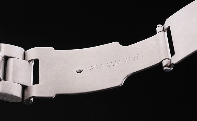 Bracelet: Borstad och polerat rostfritt länk stål armband med Omega gravyrer tryckknapp frigör driftsättning clasp