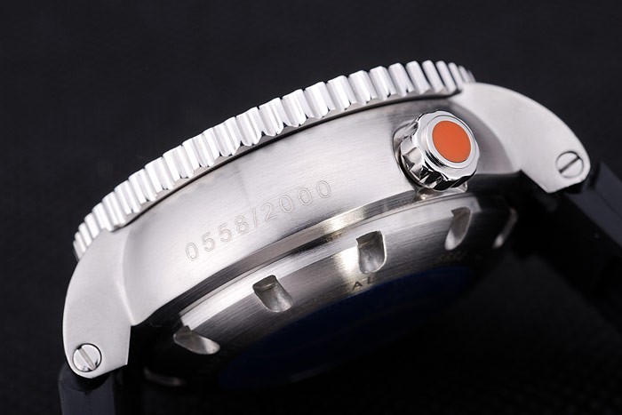 Crown: Orange emalj polerat cutwork rostfritt stål krona på övre högra plus en Oris graverad cutwork krona med två björnbär cutwork kronor på ömse sidor av den på den motsatta sidan