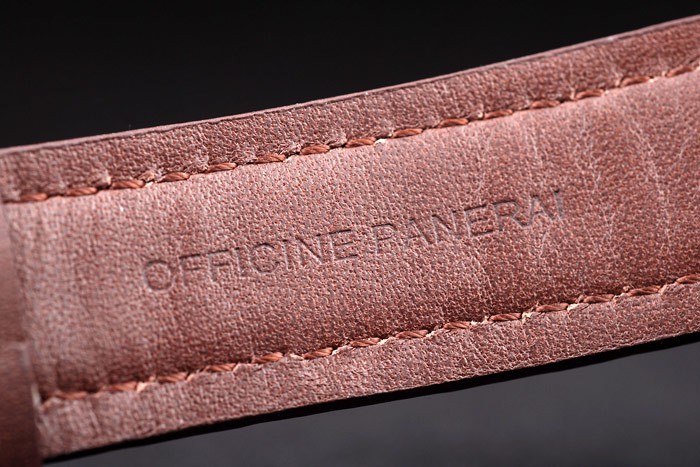 Bracelet: Mörkbrun läderrem med värme präglade Officine Panerai Italien stämpel och borstat krok i rostfritt stål -buckle lås med Panerai engraving