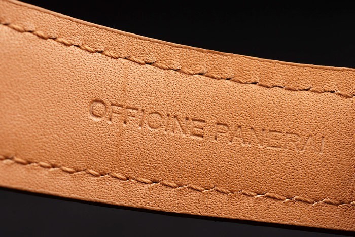Bracelet: Ljusbrun läderrem med värme präglade Officine Panerai Italien stämpel och borstat krok i rostfritt stål -buckle lås med Panerai engraving