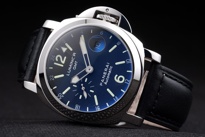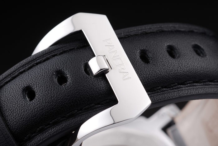 Bracelet rostfritt stål: Svart läderrem med värme präglade Luminor Panerai stämpel och polerat rostfritt stål krok spänne spänne med Panerai engraving