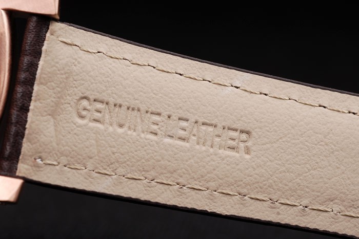 Bracelet: Brun läderrem med vita sömmar och värme präglade Luminor Panerai stämpel och 18k steg-guldpläterade krok spänne spänne med Panerai engraving