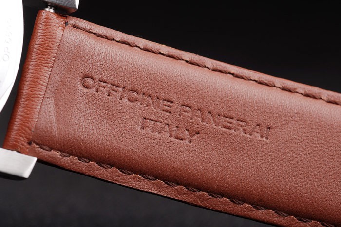 Bracelet: Brun läderrem med vita sömmar och värme präglade Officine Panerai Italien stämpel och borstat rostfritt stål krok spänne spänne med Panerai engraving