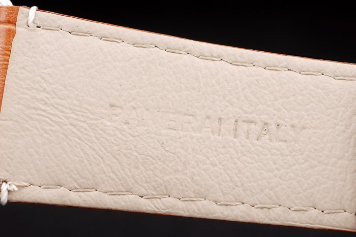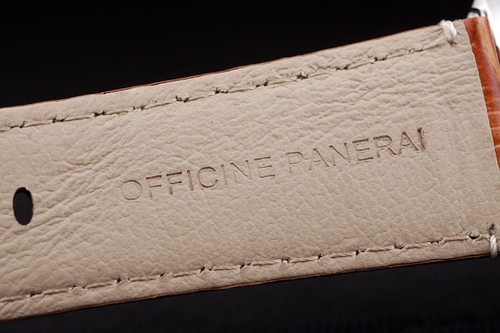 Bracelet: Brun krokodil läderrem med vita sömmar och värme präglade Officine Panerai Italien stämpel och polerat rostfritt stål krok spänne spänne med Panerai engraving