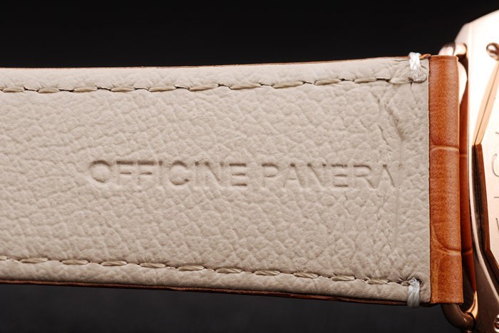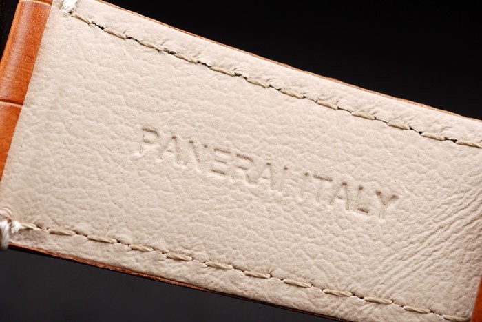 Bracelet: Brun krokodil läderrem med vita sömmar och värme präglade Officine Panerai Italien stämpel och 18k steg-guldpläterade krok spänne spänne med Panerai engraving