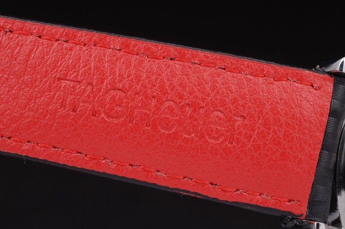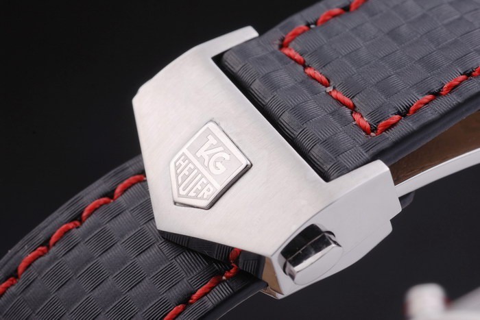 Bracelet stål: Svart läderrem med rödfärgade sömmar och en Tag Heuer märkning och borstat rostfritt stål utbyggnad clasp