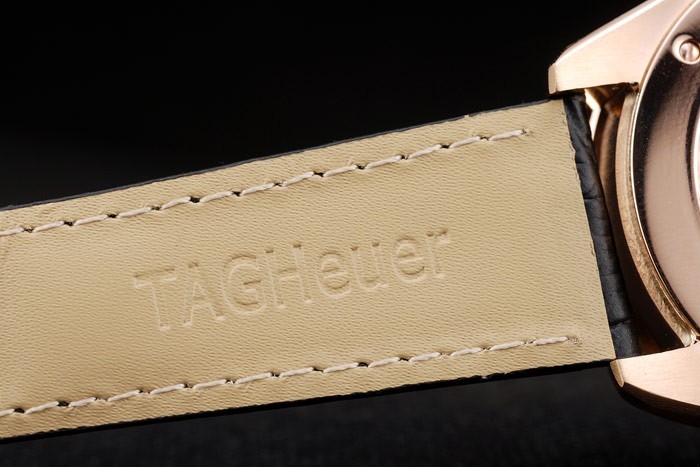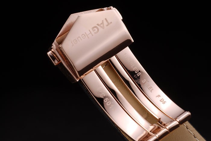 Bracelet: Heat präglade Tag Heuer svart krokodil läderrem med rose-guld tryckfrigör vika över lås med Tag Heuer logo på top