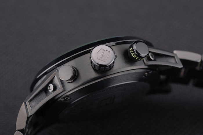 Crown: Ion-pläterad cutwork krona med Tag Heuer logotyp och två runda tryckknapp kronor på ömse sidor om it