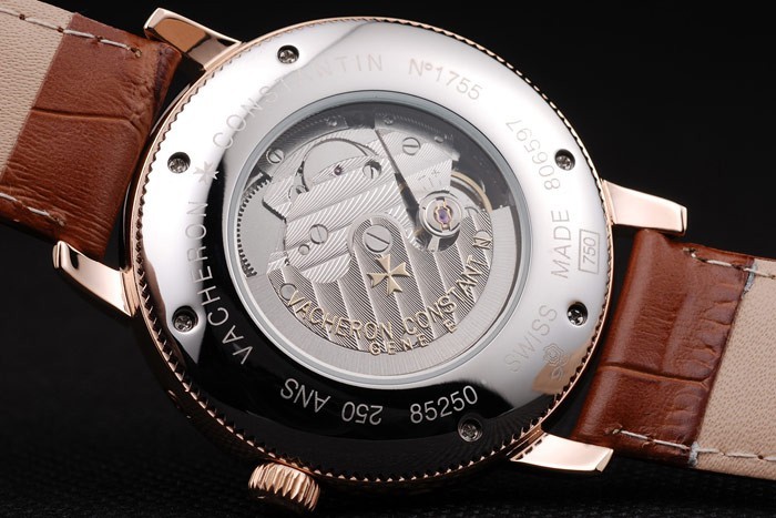 Stilren klocka som ger en högblank och exklusiv finish på din outfit. Boetten är pläterad i 18k stegguld med en boettdiameter på 49 x 43 mm. Urtavlan har ett transparent centrum med graveringar av Vacheron Constantin. Den bruna krokodilläderremmen är försedd med ett guldfärgat spänne och en längd på 211 x 20 mm.