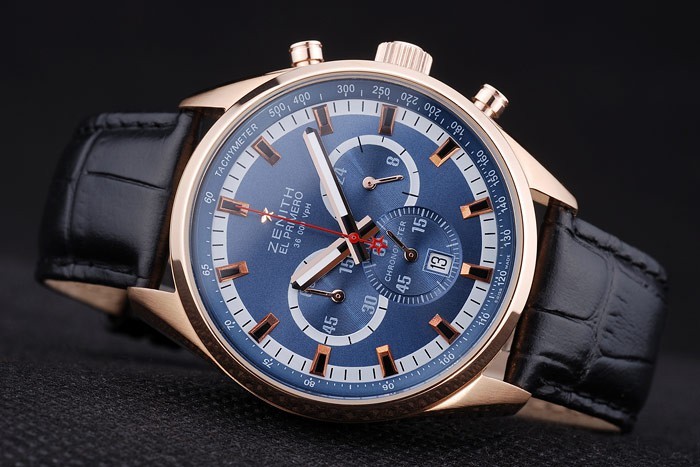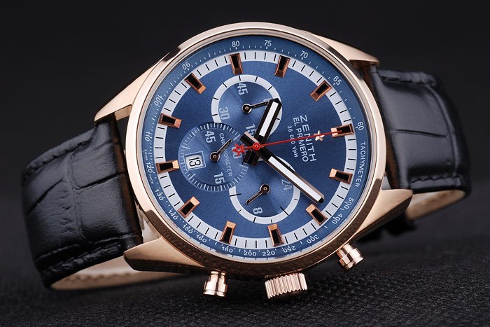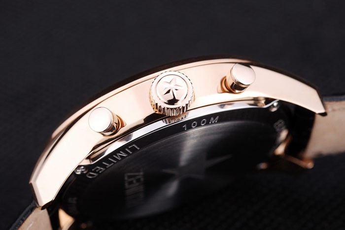 Crown: Rose-guldpläterad cutwork krona med Zenith stjärna logotyp gravyr och två mindre runda tryckknapps kronor på ömse sidor av it
