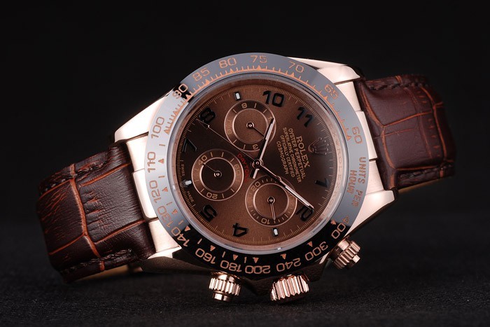 Rolex Daytona Replica klockor är tillverkade med noggrannhet och med fokus på detaljer. Med en 18k steg-guldpläterad case och en värme präglad brunt krokodil läderrem med graverad rose-guld utbyggnad lås med Rolex logo på toppen, får du en klocka som inte bara är snygg utan också bekväm att bära.